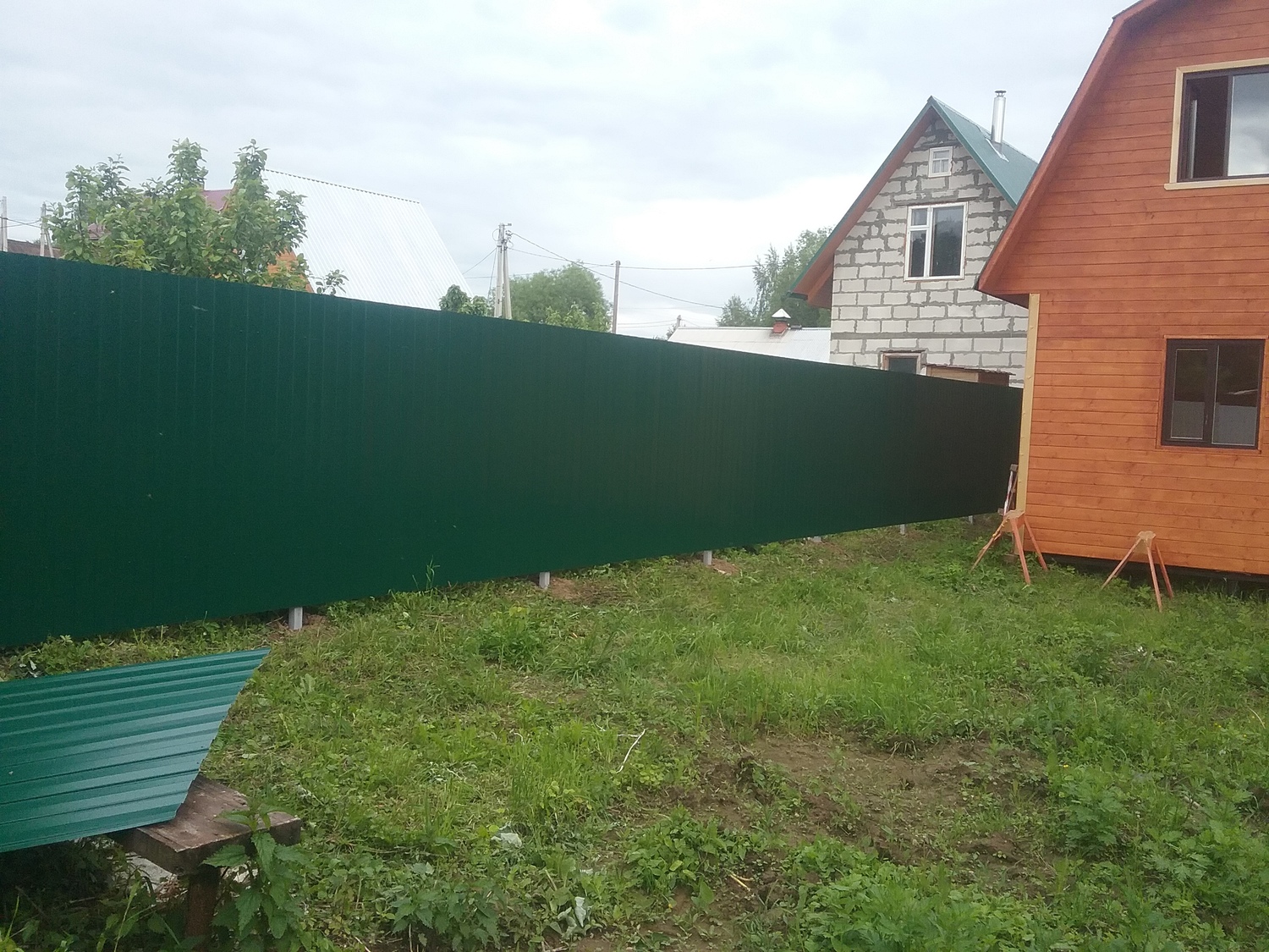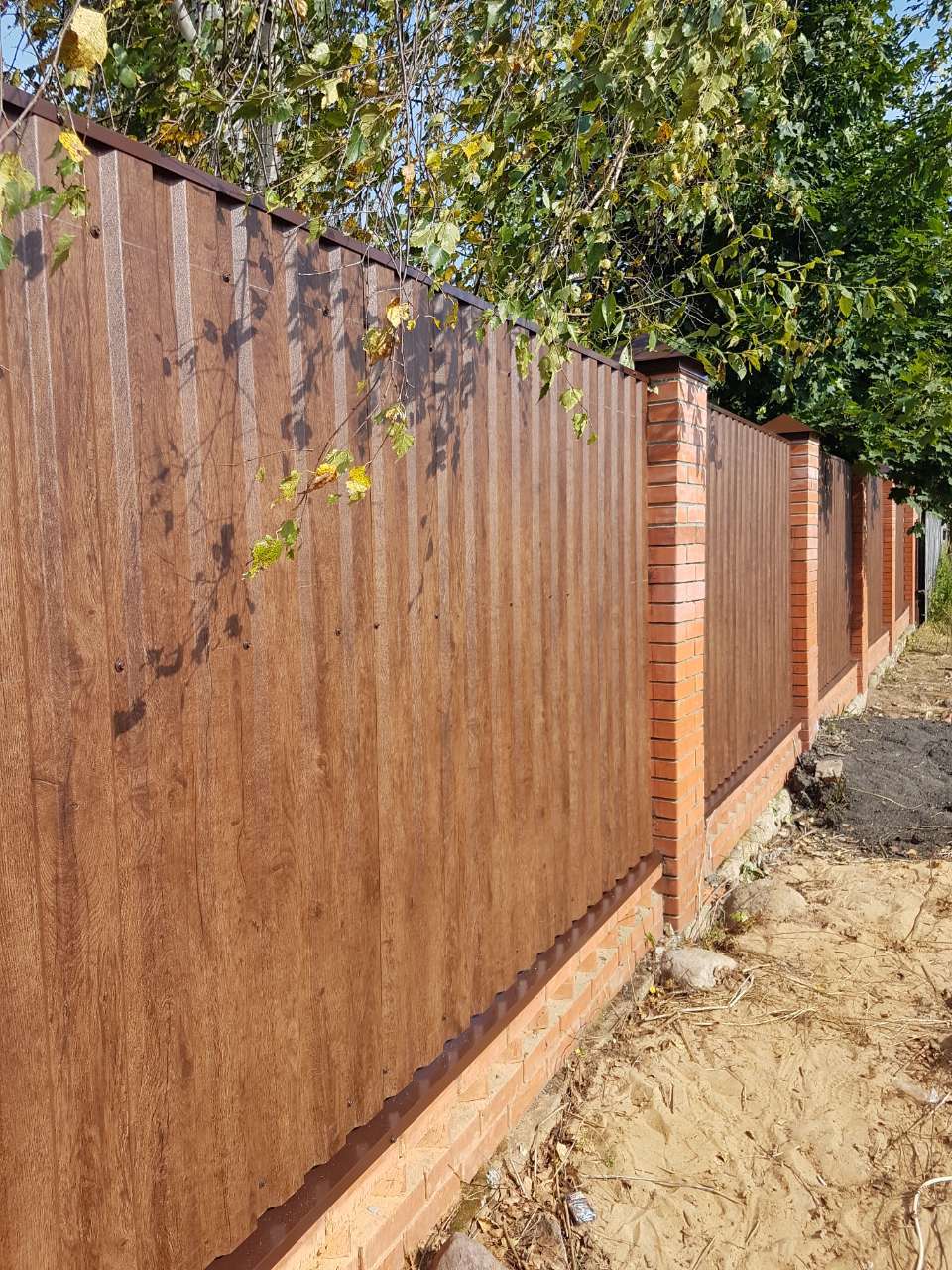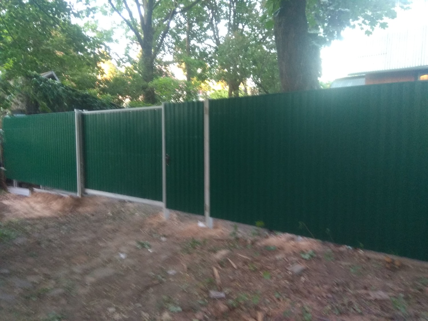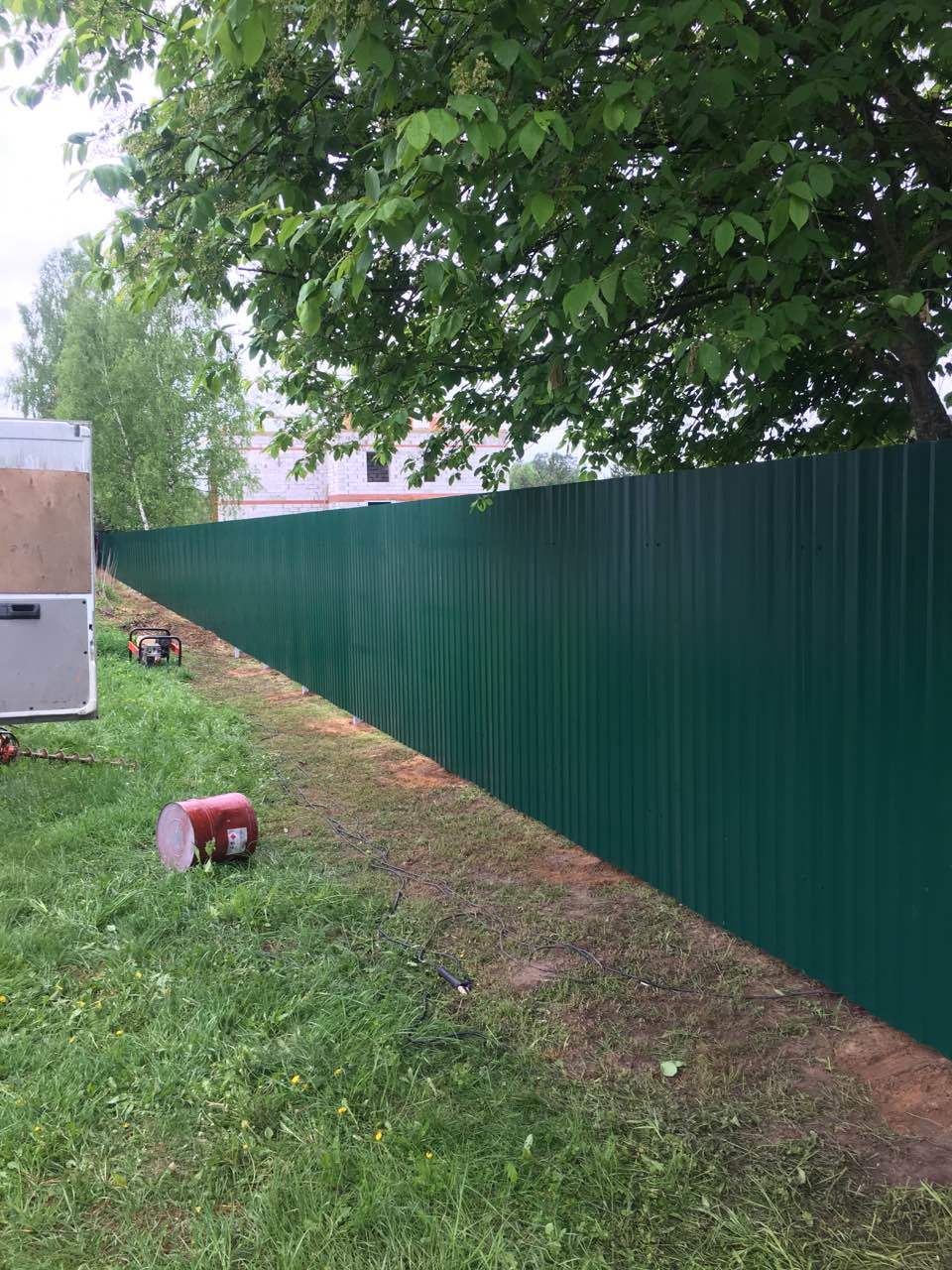 - Материал: Профнастил, металлический штакетник, сетка, проф труба, дерево